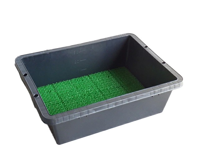 流水とブラシでの洗浄、人工芝を沈めた洗浄用の踏み込み槽の設置